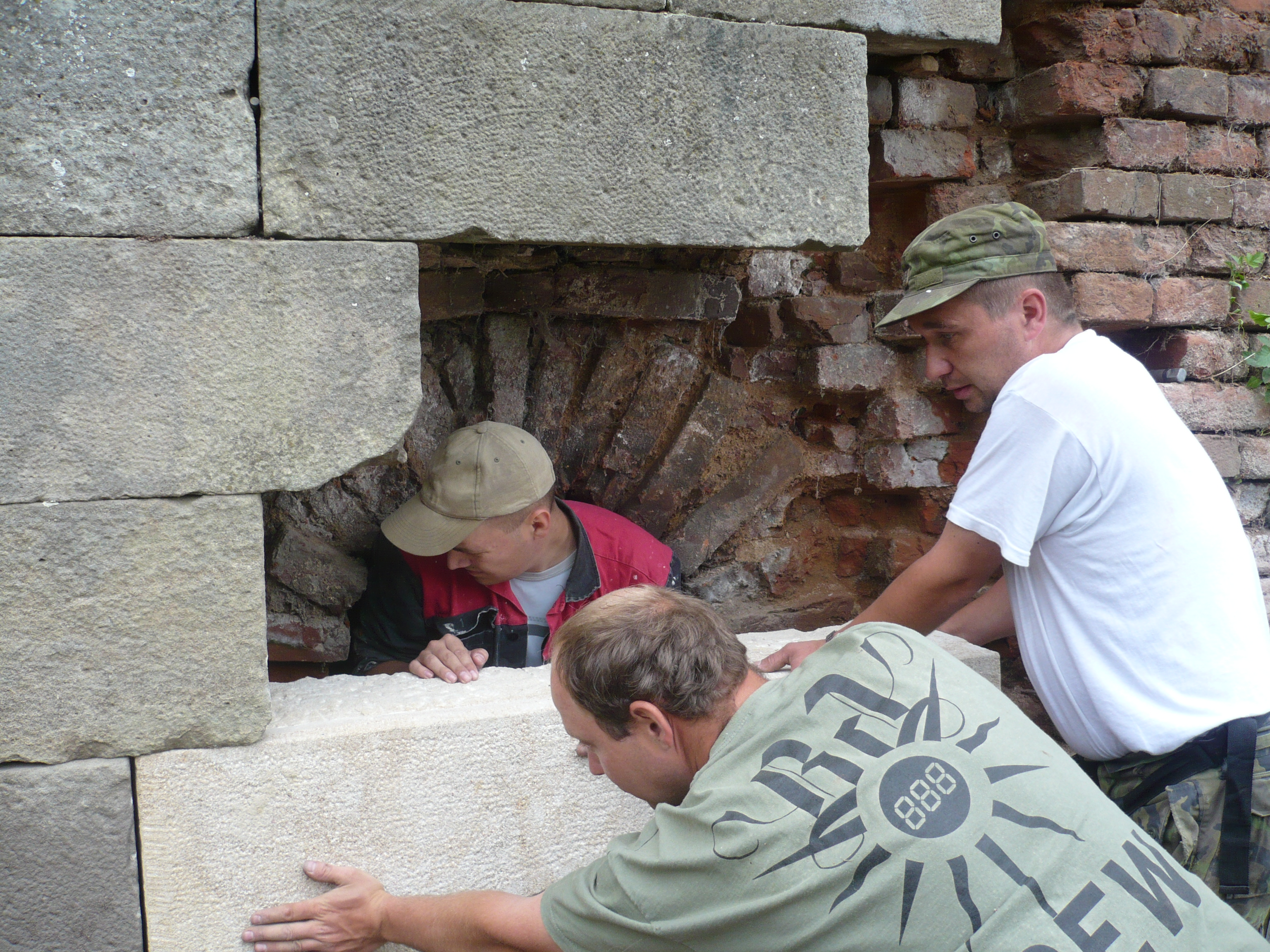 na špici Detašovaného bastionu VI v Josefově, kde členové sdružení Ravelin XIV opravují armování a zajišťují odhalenou kanalizační stoku. V sobotu 18. června bylo osazeno několik pískovcových bloků a dokončeno osazení mříže. Odpoledne došlo i na svážení cihel – šancovek, které sdružení daroval jeden z místních. Člověk by nevěřil, že „netrénovaný“ jedinec bude za chvíli pociťovat obtíže během přenášení stovek a stovek cihel o váze 8,5 kg – v každé ruce jednu… Vpravo v bílém tričku Milan Libich.