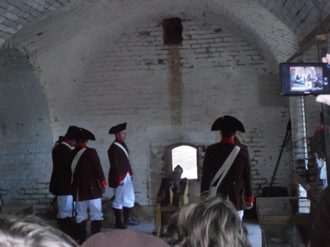 Pálilo se také z repliky šestiliberního děla z krajní dělostřelecké pravé kasematy. Na vrchní části objektu u kordonu a vnější vrstvy opláštění je jasně vidět hranice mezi zachovanou a zrekonstruovanou částí zdiva.