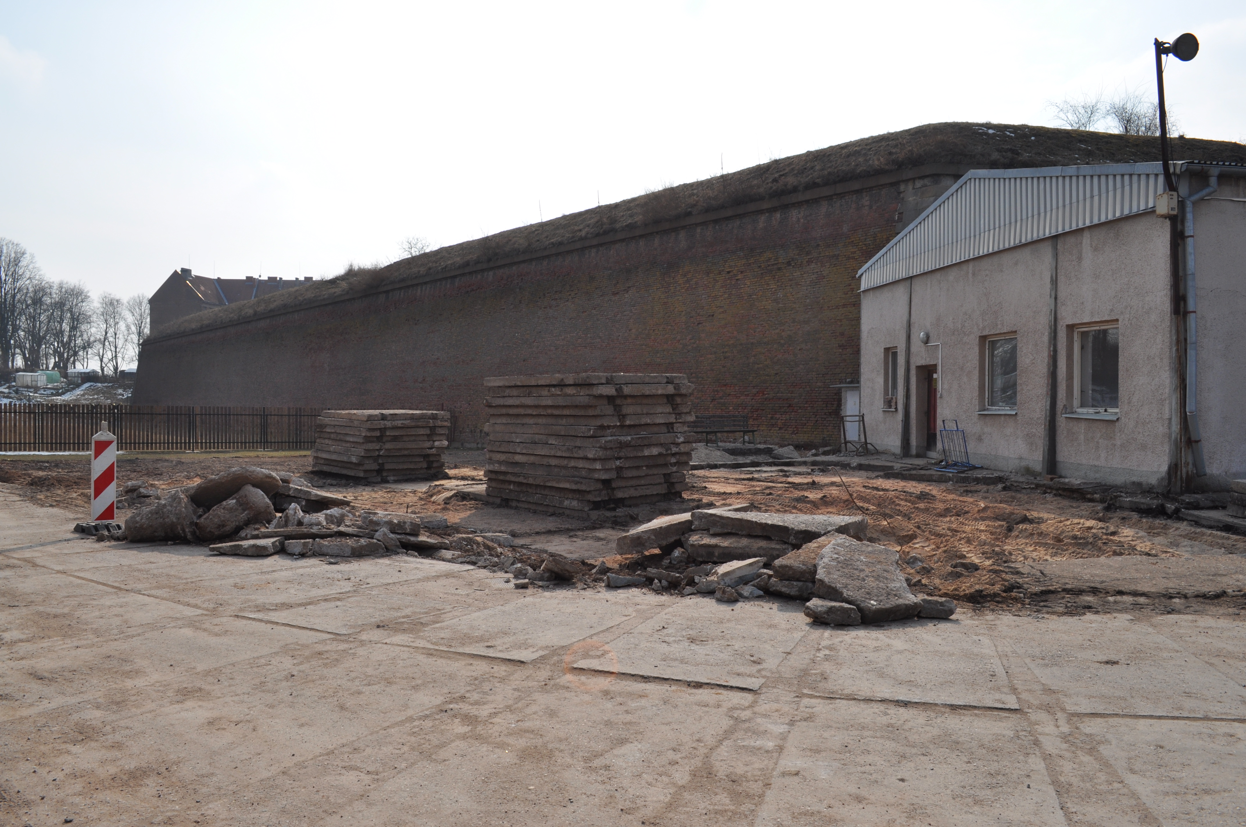 Jak je vidět z fotografií, tak jsou postupně také likvidovány betonové panely u bývalé armádní haly, kryjící levý bok Detašovaného bastionu VI. Tu čeká letos demolice a celý areál se tak pohledově výrazně promění a dispozičně projasní. Boky detašovaných bastionů totiž nesou dělové střílny a bude konečně i vizuálně mnohem zřetelnější celá dispozice a vůbec Querlondova obranná kompozice, invenčně porušující dobové kánony mezierské školy, spoléhající se na mohutnou flankovací palbu, vedenou z kasemat ze tří směrů (boky reduitu ravelinů, boky detašovaných bastionů a boky bastionů) do klíčových prostor před špicemi detašovaných bastionů, kudy by nepřítel s největší možnou pravděpodobností sestupoval do příkopu a snažil se pronikat dále.
