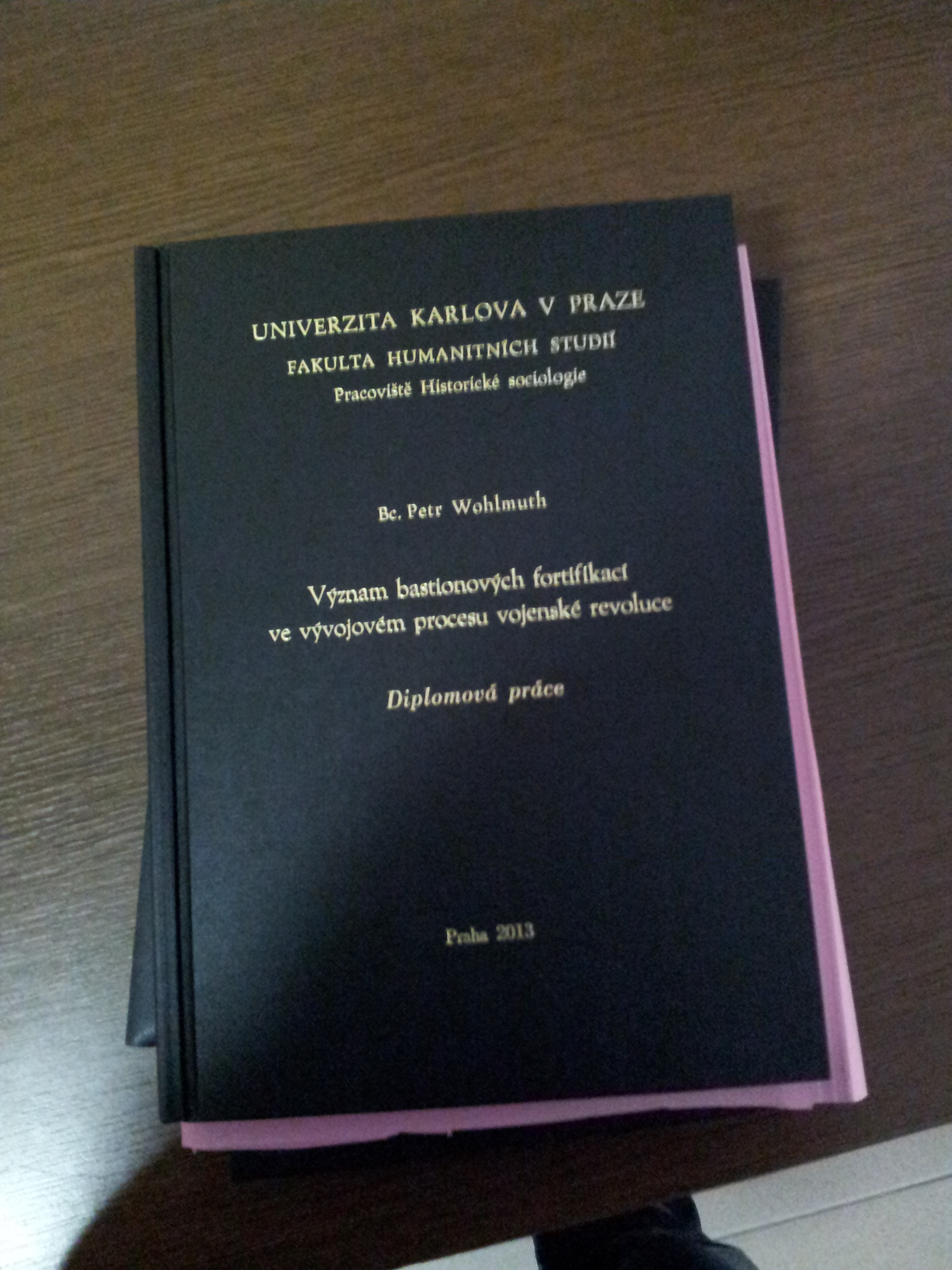 Dnes jsem úspěšně završil magisterské studium na Pracovišti Historické sociologie Fakulty humanitních studií Univerzity Karlovy obhajobou diplomové práce „Význam bastionových fortifikací ve vývojovém procesu vojenské revoluce“. Jen v rychlosti jsem ji jak jsem přislíbil, v PDF verzi zpřístupnil v sekci Kdo jsem. Všem kolegům, přátelům a členům vojensko-historických sdružení, kteří mě podporovali a povzbuzovali v mé práci, tímto srdečně děkuji a těším se na další spolupráci.
