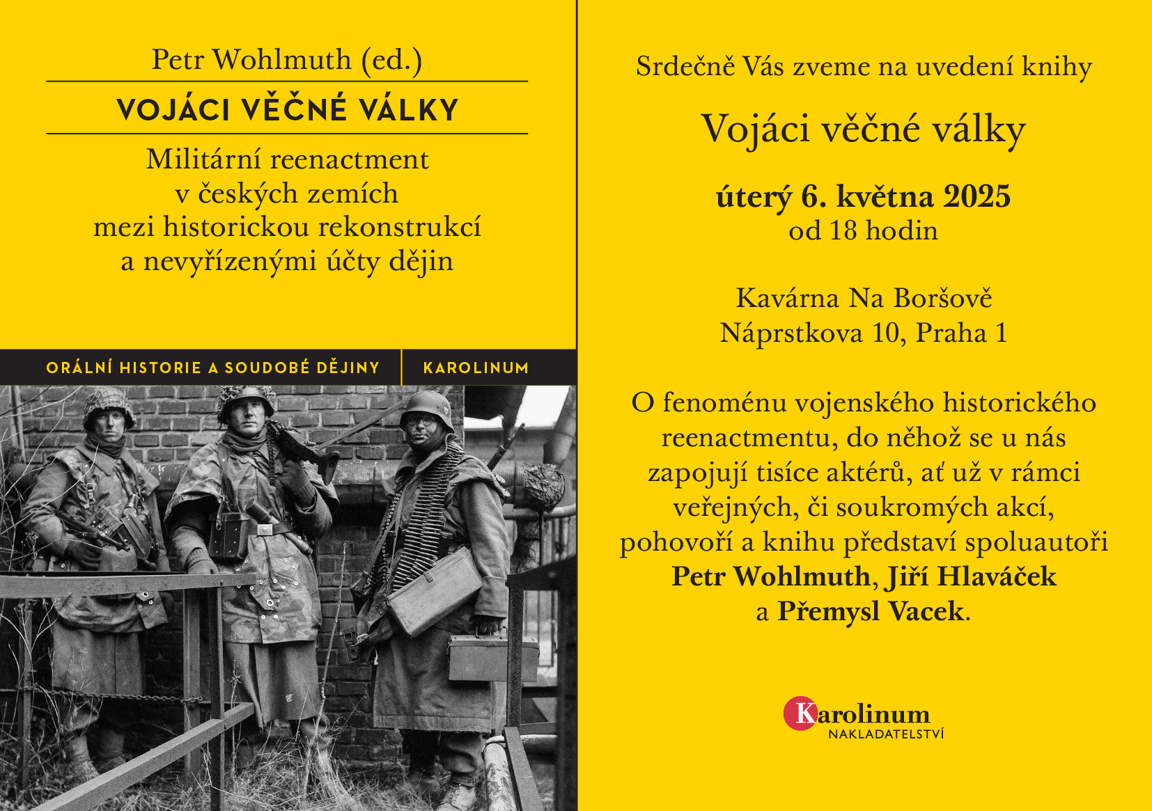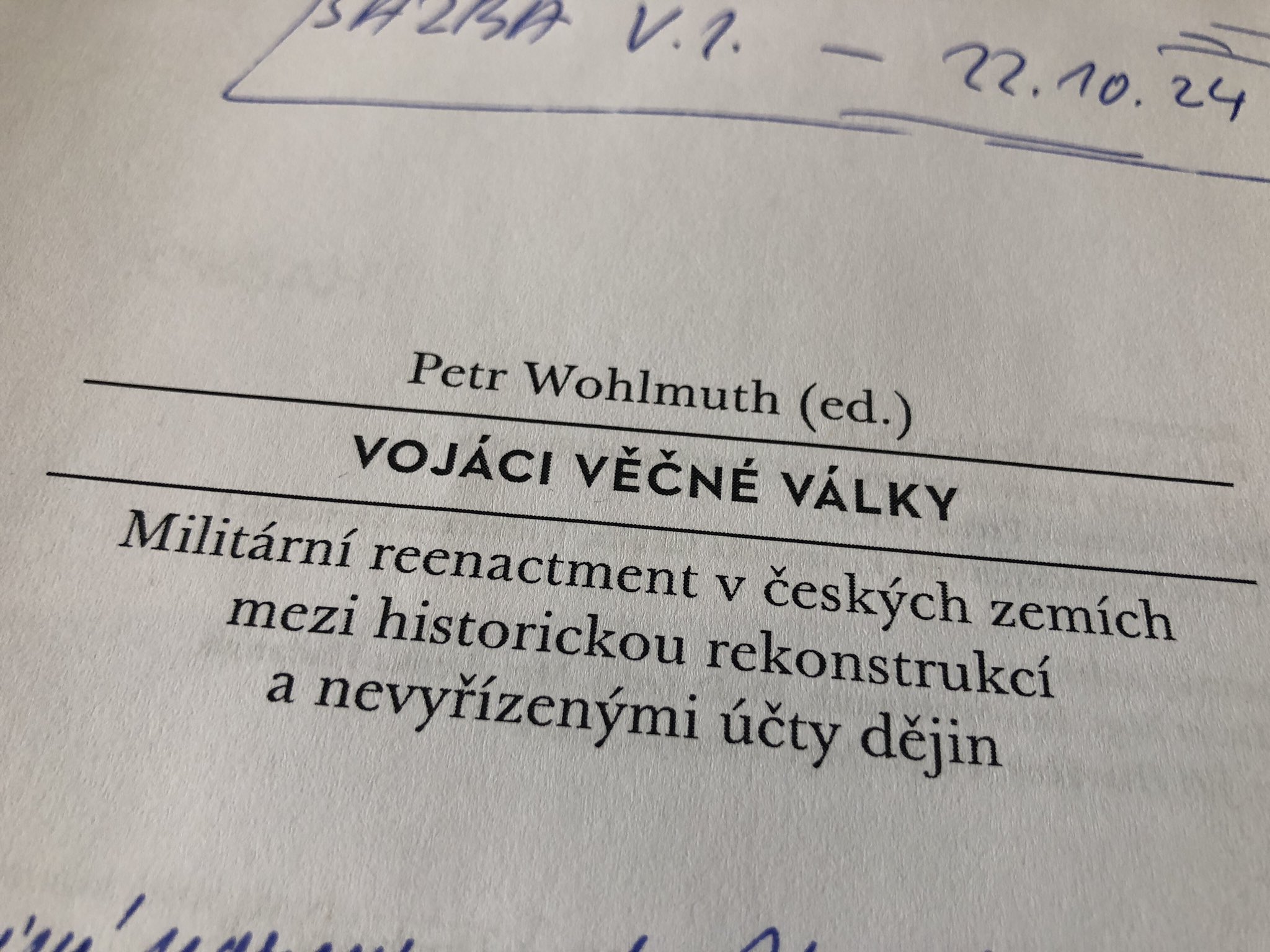 Příští týden, tedy patnáctého ledna 2025, se na pultech knihkupectví ocitne plod našeho tříletého výzkumného projektu, zaměřeného na soudobé dějiny a kulturu vojenského historického reenactmentu v českých zemích. Kolektivní monografie Vojáci věčné války, za níž stojím jednak já coby editor a spoluautor a dále kolegyně Lenka Hadarová a kolegové Jiří Hlaváček a Přemysl Vacek, už při letmém pohledu představuje pouze pomyslný první díl, prezentující zkoumání tak nesmírně bohatého kulturně-historického fenoménu. Informace na webu nakladatele (Karolinum) zde. Je těžké shrnout v krátkém odstavci tři hektické roky, kdy jsme se nořili do v českém prostředí zatím téměř naprosto neprozkoumané problematiky. Text je teoreticky metodologicky ukotven do postpozitivistické orální historie a reenactment studies po afektivním obratu. Přestože se nám nepodařilo získat prostředky na další výzkum, tak z pole výzkumu vojenského historického reenactmentu neodcházíme. Vojenský historický reenactment znamená mnohem více, než jen skupinu lidí, oblečených do „podivných“ uniforem a jedná se o aktivitu, významně ovlivňující naši politiku paměti a produkci historického významu ve vztahu i k těm nejvýznamnějším symbolickým historickým centrům našich dějin. Jinými slovy: narazili jsme na obrovskou a nevídanou hloubku problematiky, kterou naše jednotlivé konceptuálně ukotvené kapitoly (produkce historického významu, násilí a tělesnost, gender, aktérství zbraní, afekty nostalgie apod.) zatím „pouze“ na pěti stech stranách načrtávají. – Petr Wohlmuth, ed., Vojáci věčné války. Militární reenactment v českých zemích mezi historickou rekonstrukcí a nevyřízenými účty dějin (Karolinum: Praha, 2024), 492 s.