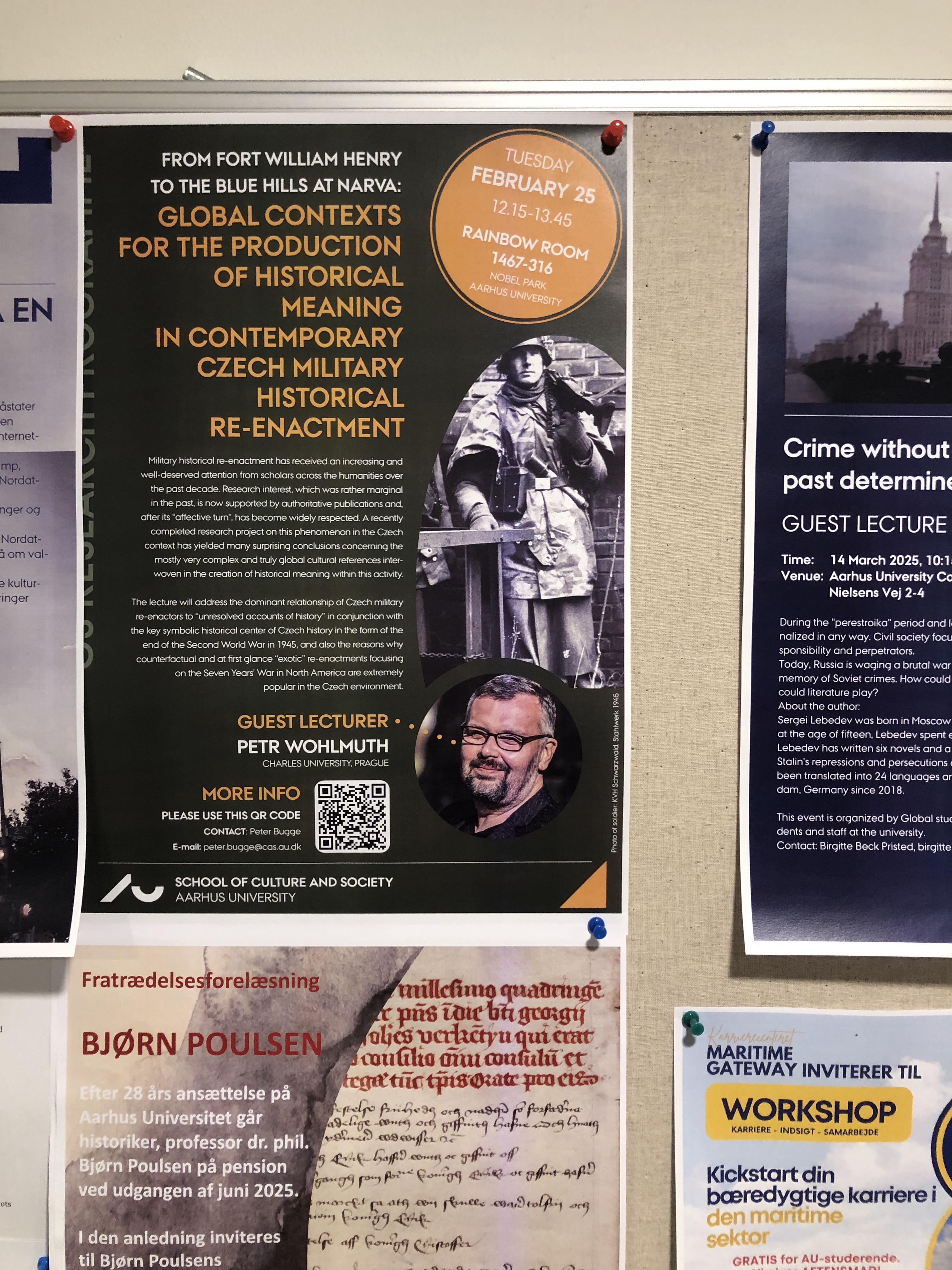 Únor a začátek března jsem strávil na univerzitě v dánském Aarhusu na School of Culture and Society, katedře Global Studies, kde jsem měl tu čest přednášet na téma teorie orální historie a rovněž seznámit mezinárodní odbornou veřejnost s výsledky našeho orálněhistorického výzkumu militárního historického reenactmentu v českých zemích. Čas na této skvělé univerzitě utekl jak voda. V Aarhusu mimo jiné na School of Anthropology působí jeden z předních expertů na reenactment studies, prof. Mads Daugbjerg, se kterým jsem rovněž měl tu možnost se setkat a konzultovat. Mým průvodcem na univerzitě byl skvělý bohemista a historik Peter Bugge, kterému patří můj velký dík. Děkuji také historičce Adéle Sobotkové, která působí v Aarhusu na School of Culture and Society a jejíž nejnovější projekt zkoumání historie civilní obrany v Dánsku během studené války mě velmi zaujal.